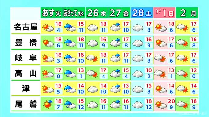 3連休最終日も“春本番の陽気” 名古屋・鶴舞公園には午前中から多くの家族連れ 予想最高気温は名古屋・津18℃ 豊橋・尾鷲20℃ 愛知・岐阜・三重の天気予報(2/23 昼) 2026年2月23日(月) 13:03 国内 天気 3連休最終日のきょうも、春本番の陽気が続きそうです。名古屋・昭和区の鶴舞公園には、きょうも午前中から大勢の家族連れが訪れています。(親子連れ 午前10時半ごろ)「(子どもの)テンションが上がっちゃって…