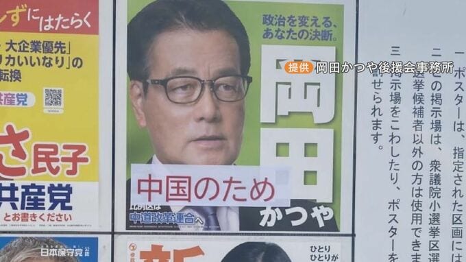中道・岡田克也氏の衆議院選挙ポスターに「中国のため」 と貼り紙 落書きも 三重の50代男性に罰金20万円の略式命令 2026年3月18日(水) 18:48 国内 岡田克也さんの選挙ポスターに、「中国のため」などと書かれた紙を貼るなどした罪で罰金20万円の略式命令です。起訴状によりますと、三重県桑名市の50代の男性は、衆院選の公示日だった今年1月27日と先月3日、桑名…