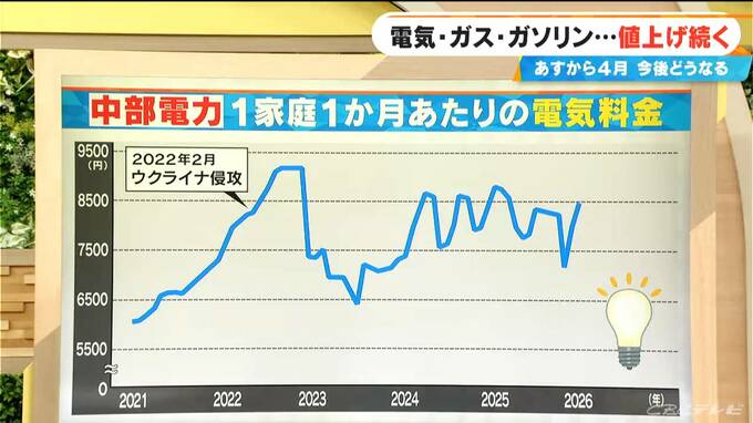 まずは電気料金。 ここ5年ぐらいで見てみると、ロシアがウクライナ侵攻をしたときは、価格がどんどん上がっていきました。モデル家庭1か月あたりで9000円を超えていたときも。その後、大幅に下がったり上がったりを繰り返していますが、 これは「補助金」が入ったり入らなかったりのタイミングなんです。