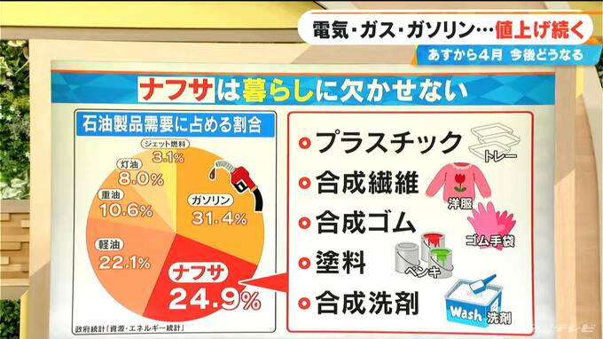そして、この中東情勢の影響は、原油から精製される「ナフサ」にも。このナフサはガソリンにつぐ需要があり、プラスチックトレー、合成繊維や洗剤まで我々の暮らしに欠かせないものなんです。