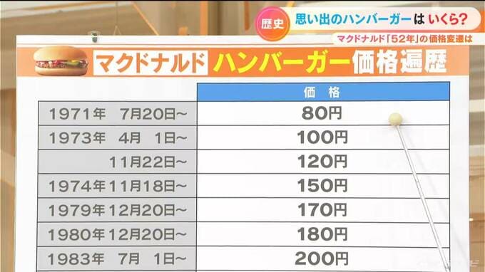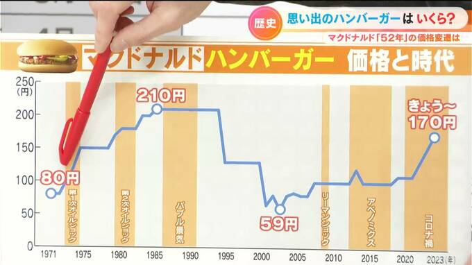 第1次、第2次のオイルショックを経てハンバーガーの値段がどんどん上がっていき、バブル期の頃に210円で最高値だったんです。