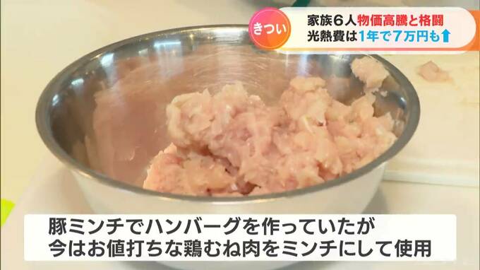 「きょうは鶏のむね肉に豆腐を入れてハンバーグにしようかなと思ってます。やっぱり子どもが4人なので、量が要る。豆腐でかさ増しして量を増やそうかなと」