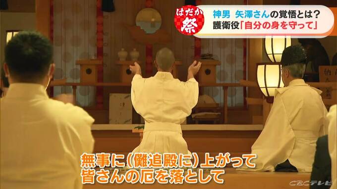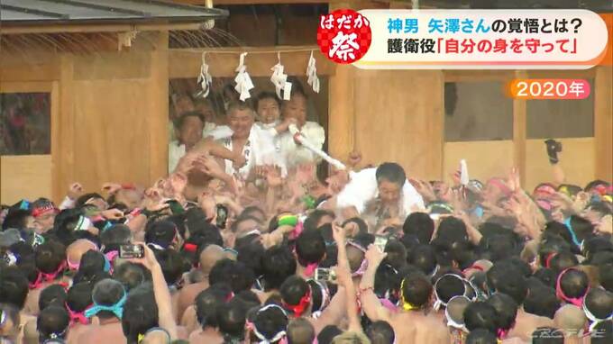 祭のクライマックスとなるはだか男の「もみ合い」。「神男」に厄(やく)をあずけようと、数千人が押し寄せるため、危険と隣り合わせです。このため、数人の護衛役が神男を取り囲んで連れていきます。