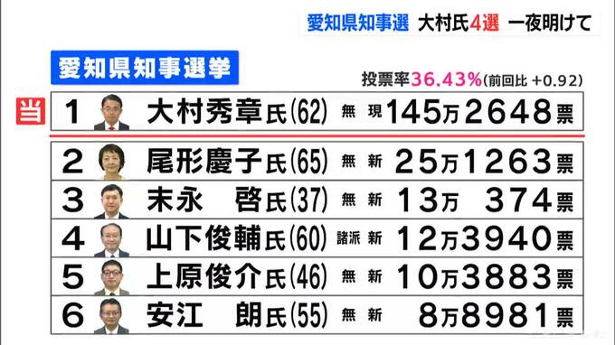5日投開票が行われた愛知県知事選挙では、現職の大村秀章さんが、共産党が推薦する尾形慶子(おがた・けいこ)さんら5人の新人候補に大差をつけ、4回目の当選を果たしました。