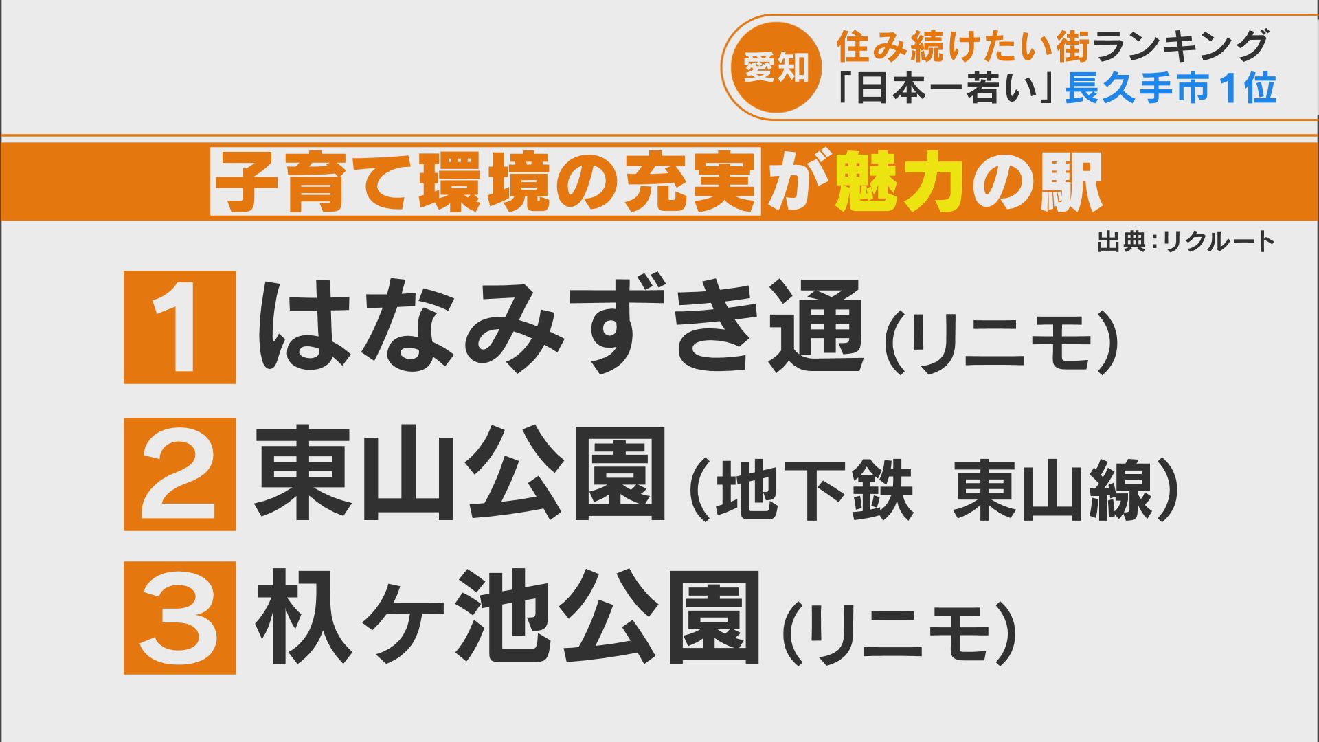 「子育て環境の充実が魅力の駅ランキング」の愛知県版で第1位に選ばれたのがリニモ(東部丘陵線)の「はなみずき通駅」。3位にも「杁ヶ池公園駅」が入って、長久手市内のリニモの駅がベスト3のうち2つを占めました。