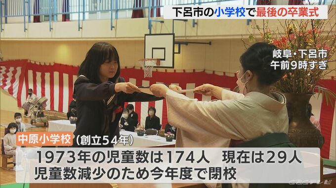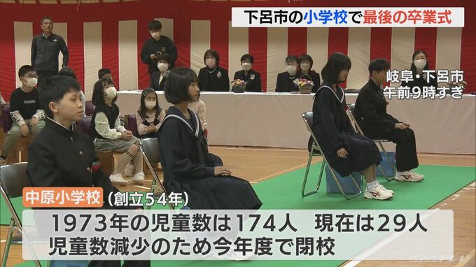 創立54年となる下呂市の中原小学校は最盛期の1973年には174人の児童が通っていましたが現在は29人で、児童数の減少などから今年度限りで閉校することになりました。最後の卒業生は4人で、卒業証書を受け取り全員で感謝の言葉を述べました。