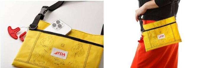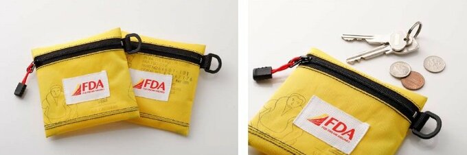 商品は機内に搭載されていたライフベストを再利用した掛けカバンタイプの『FDAライフベストサコッシュ』と、財布タイプの『FDAライフベストミニウォレット』です。
