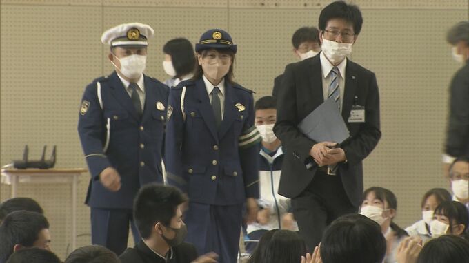 21日、岐阜県警の一日交通部長を委嘱され、母校の県立岐阜商業高校で、後輩の3年生、およそ360人が参加した交通安全教室に出席しました。