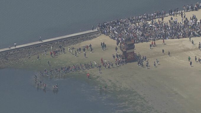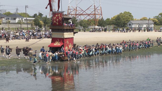 海に向かって進む、高さ約6.5メートル、重さ2.5トンを超える巨大な山車。半田市の浜辺で「亀崎潮干祭」が行われ、大勢の親子連れらが見守りました。