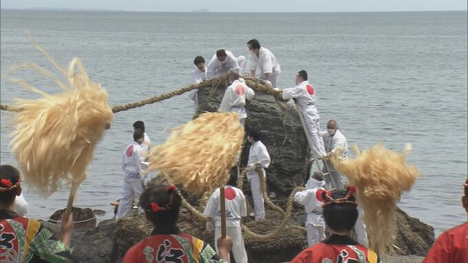 夫婦岩で長さ35メートルの大しめ縄を張り替え 三重県伊勢市の二見興玉神社 “縁結びのシンボル”大注連縄で太く堅く結ばれる 2023年5月5日(金) 19:58 国内 三重県伊勢市の二見興玉(ふたみおきたま)神社で「夫婦岩(めおといわ)」にかけられた大しめ縄を張り替える神事が行われました。伊勢市の二見興玉神社では5日、神職や氏子らが、長さ35メートルもある大しめ縄を…