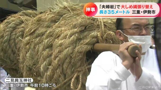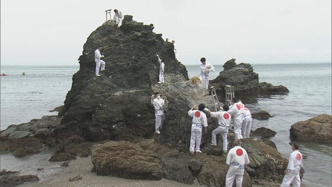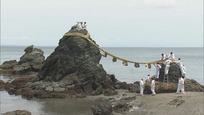 伊勢市の二見興玉神社では5日、神職や氏子らが、長さ35メートルもある大しめ縄を夫婦岩まで運び、2つの岩にそれぞれよじ登り巻きつけていきました。