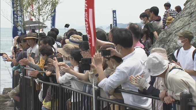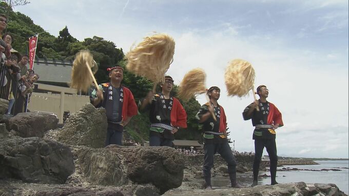 三重県伊勢市の二見興玉(ふたみおきたま)神社で「夫婦岩(めおといわ)」にかけられた大しめ縄を張り替える神事が行われました。