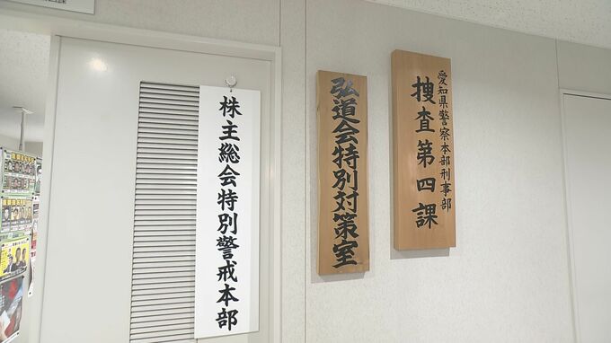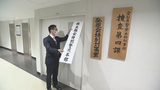 愛知県警本部では8日、暴力団などを取り締まる捜査4課の部屋の前に、「株主総会特別警戒本部」の看板が掲げられました。