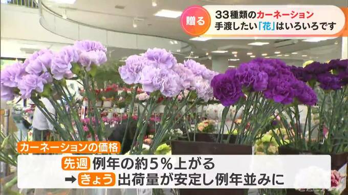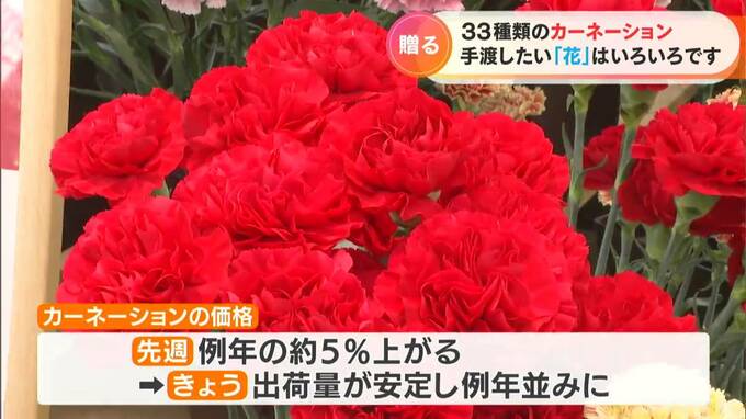 今年のカーネーションの価格は、前の週は例年の5%ほど上がっていたといいますが、母の日に向けて供給が増えて出荷量が安定したことから、12日には例年並みの価格になってきたといいます。
