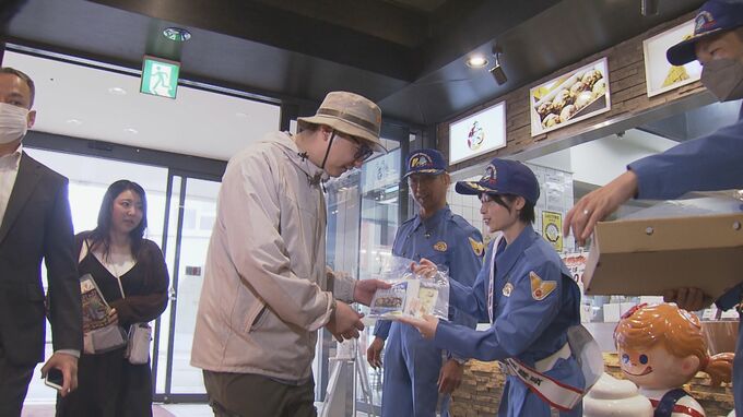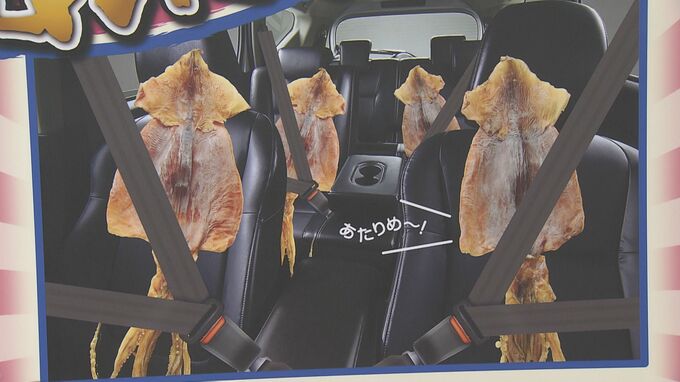 19日午前、刈谷ハイウェイオアシスで愛知県警高速隊の隊員やネクスコ中日本の職員らが配ったのは、「あたりめ」。
