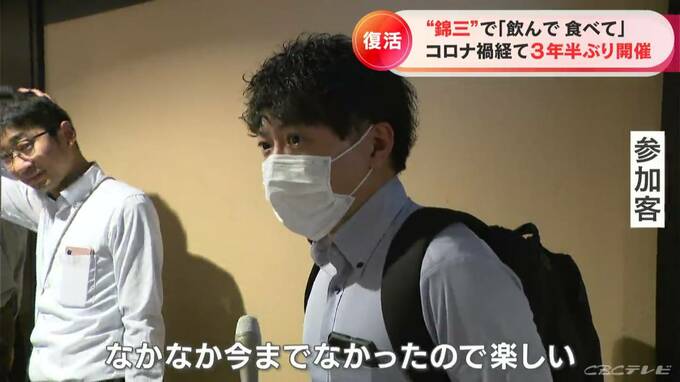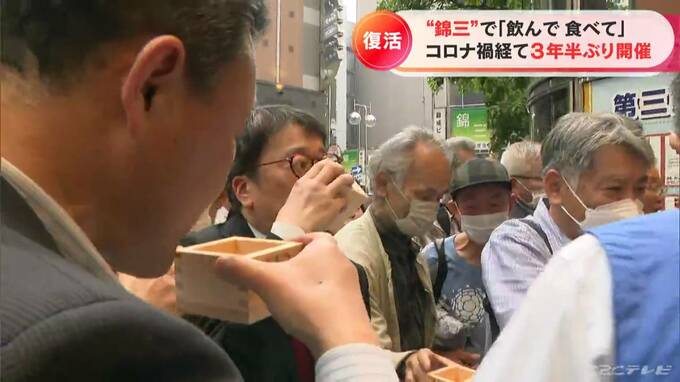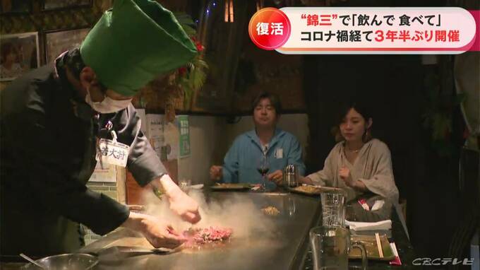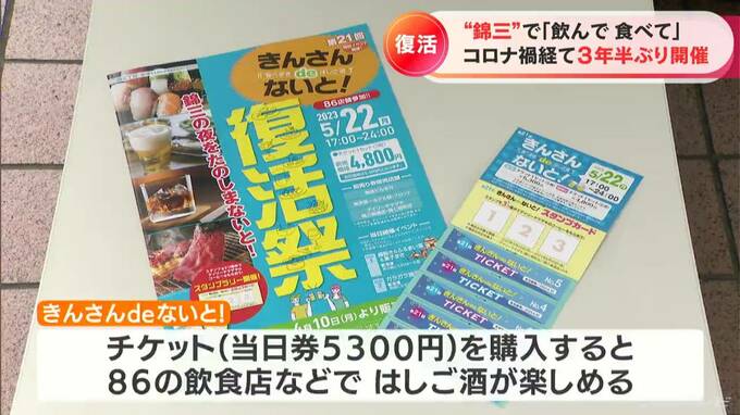 名古屋の繁華街・錦三丁目でオープニングセレモニーが行われた「きんさんdeないと」。チケットを購入すると、86の参加店舗で食べ歩きやはしご酒が楽しめます。新型コロナ禍の中止を経て、3年半ぶりに開催されました。