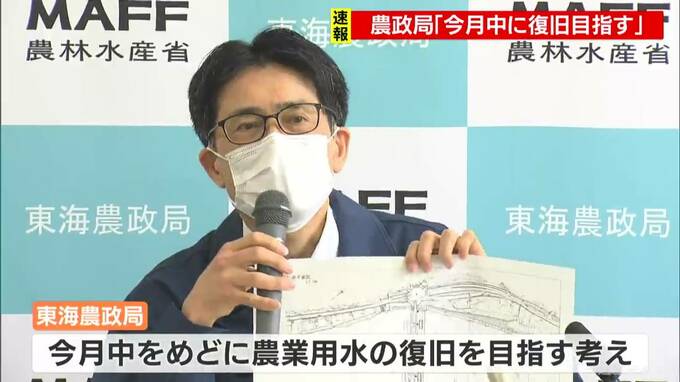 水漏れが起きた明治用水頭首工を所管する東海農政局は、午前11時から会見を開き、5月中をめどに、農業用水の復旧を目指す考えを明らかにしました。