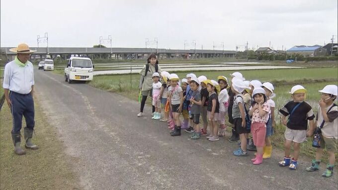 豊川市の「みと保育園」と「御津南部保育園」では、お米がどのように作られているのかを知ってもらおうと、毎年、田植え体験を行っています。