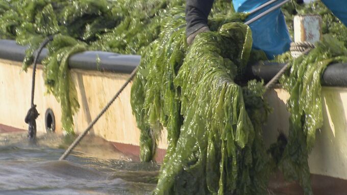 青のりなどの原料になるアナアオサの収穫最盛期 全国有数の産地愛知・田原市 2023年5月28日(日) 12:04 国内 愛知県田原市で、青のりなどの原料になる「アナアオサ」の収穫が最盛期を迎えています。田原市は全国有数のアナアオサの産地で、収穫の最盛期を迎えている今は1日におよそ33トンが収穫されます。漁師たちが「トン…