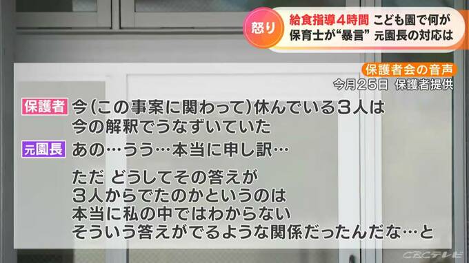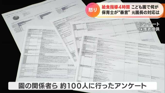 保護者が園の関係者ら100人に行ったアンケートでは、「子どもが先生にハサミで小突かれて、痛かったし怖かったと話した」「友達がうんちをすると『汚い』『くさい』ときつい言葉で怒られているのを見て、保育園でうんちができなくなった」といった回答がありました。