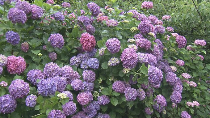 色鮮やかなアジサイが見頃 三重・志摩市 2023年6月1日(木) 01:26 愛知 梅雨空に色鮮やかなアジサイ。三重県志摩市の寺では色とりどりのアジサイが見頃を迎えています。志摩市大王町の大慈寺は「アジサイ寺」とも呼ばれ、梅雨の時季は色とりどりのアジサイが境内を彩ります。 寺では、…