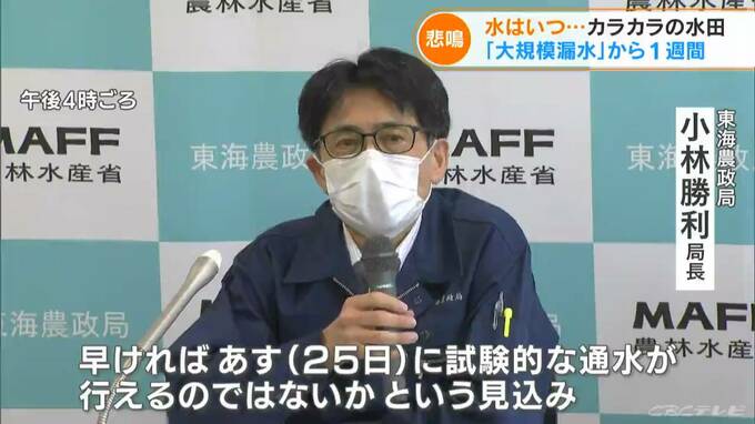 東海農政局は会見で、5月中の給水再開に向け、不具合などが無いかを確認するため、25日にも試験的に農地に水を通す方針を示しました。