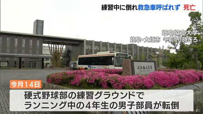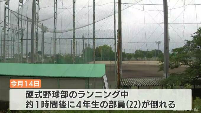 部員が亡くなったのは、大垣市の岐阜協立大学で、大学によりますと5月14日、硬式野球部員およそ30人が、コーチの指示でランニングをしていたところ、およそ1時間後に、4年生の男子部員が倒れました。
