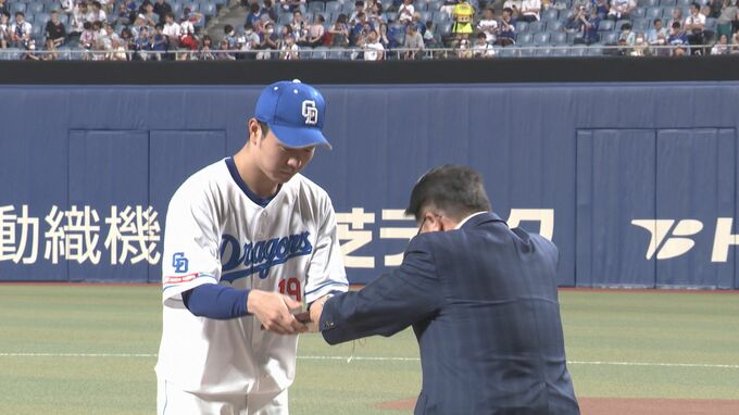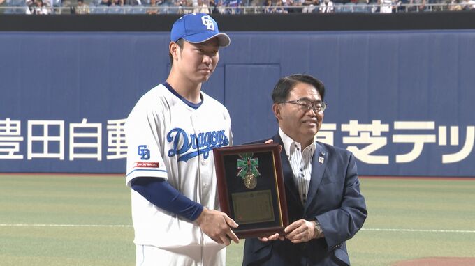16日、名古屋市東区のバンテリンドームナゴヤで授与式が行われ、今年3月のWBCで、アメリカとの決勝に登板し、日本代表の14年ぶりとなる優勝に貢献した中日ドラゴンズの高橋宏斗投手に、スポーツ功労賞と記念品が贈られました。