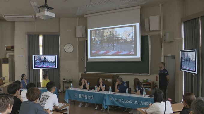 「こちらが講義室です。声が聞こえてまいりました。いらっしゃいますね、今、ウクライナの選手の皆さんが、至学館大学の学生を前に戦時中がどんな状況なのかを語っています」
