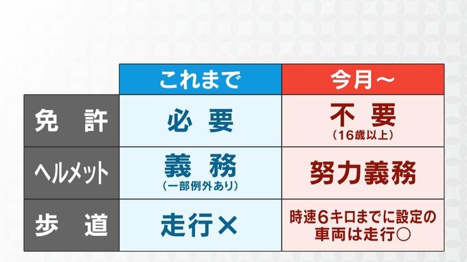 道路交通法の改正で7月から、自転車と同じくらいの大きさで、最高速度が時速20キロ以下のものについては、16歳以上であれば、運転免許が無くても乗れるようになりました。
