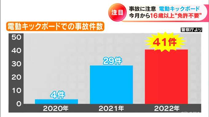 警察庁によりますと電動キックボードでの事故は年々増えていて、去年は41件起きています。