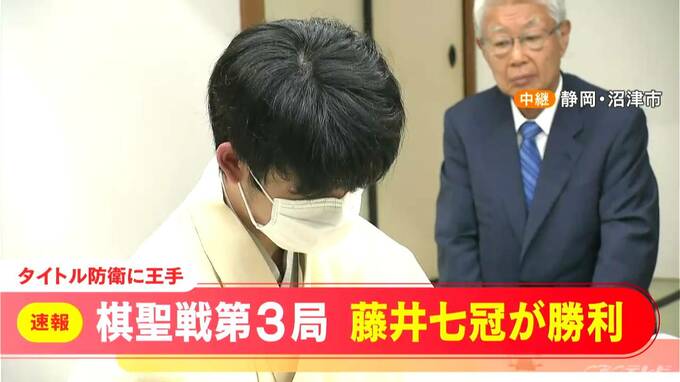 将棋の藤井聡太七冠(20)が静岡県沼津市で行われた棋聖戦第3局で、挑戦者の佐々木大地七段(28)を下し、タイトル防衛に王手をかけました。