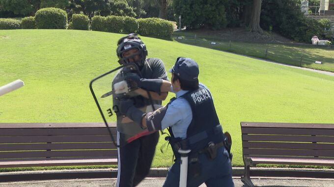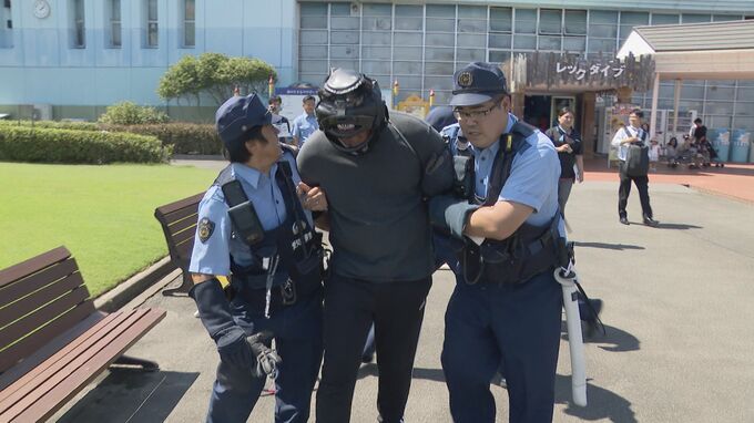 夏休みでにぎわうレジャー施設での緊急事態に備えて行われたもので、水族館の職員が110番通報し、犯人を客から遠ざけている間に、駆けつけた警察官が盾などを使って不審者を取り押さえるまでの動きを確認しました。