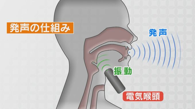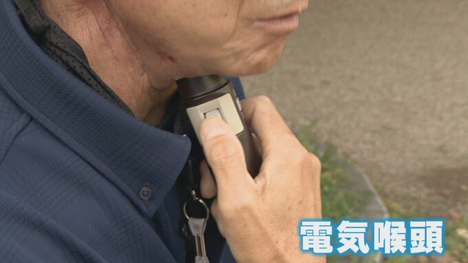 電気喉頭とは、声帯がなく声を出せない人が言葉を発することを補助する機械。「ブー」という音を出す機械をのどに押し当てて使用する。