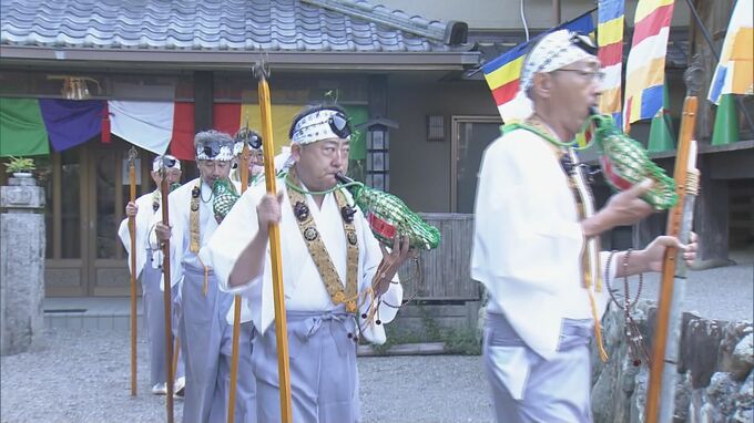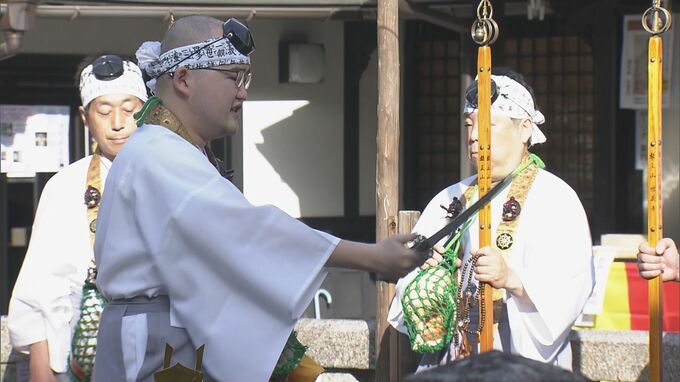 午前7時、本堂前に山伏姿の修験者20人がほら貝の音とともに集まり、日本刀で場を清めて「一番護摩法要」が始まりました。