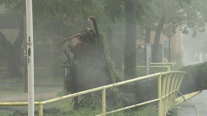 倒れたのは中区にある千早公園の高さ15メートルほどの木で、倒れた影響でフェンスや街路樹をなぎ倒しています。