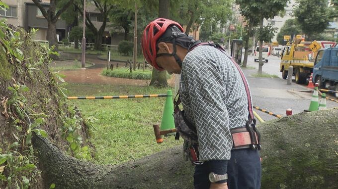 12日、木が倒れた中区の千早公園では、13日午前中に樹木医が現場に入りました。