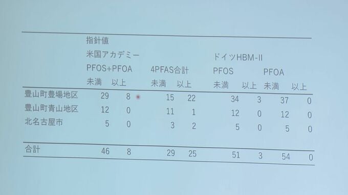 そして、特に有害性が指摘される「PFOS」「PFOA」の合計で、アメリカアカデミーの指針値20ナノグラムを超えた人も54人中8人いました。