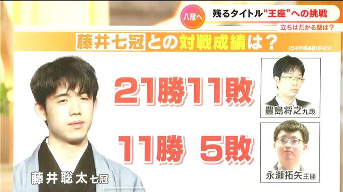 豊島九段と永瀬王座の2人は藤井七冠の「全冠制覇」に立ちはだかる大きな壁ということになります。対戦成績を見てみましょう。
