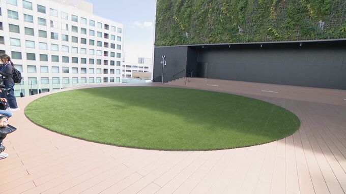 そして、7階にあるのが屋上広場で、ウッドデッキ中央には、かつての展望レストランのデザインを引き継いだ芝生があり、新たな中日ビルのロゴのモチーフにもなっています。