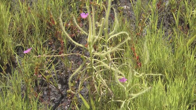 ナガバノイシモチソウはモウセンゴケ科の食虫植物で、葉から粘液を出し小さな昆虫を捕えます。通常、夏に白い花を咲かせますが、国内では豊橋市と豊明市の2か所でのみ赤い花を咲かせます。