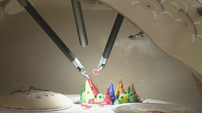 子どもたちは、手術用の器具を取り付けた4本のアームを遠隔操作し、円錐状の小さな突起に輪ゴムを通すという課題に挑戦。コツを覚えながら着実にクリアしていきました。