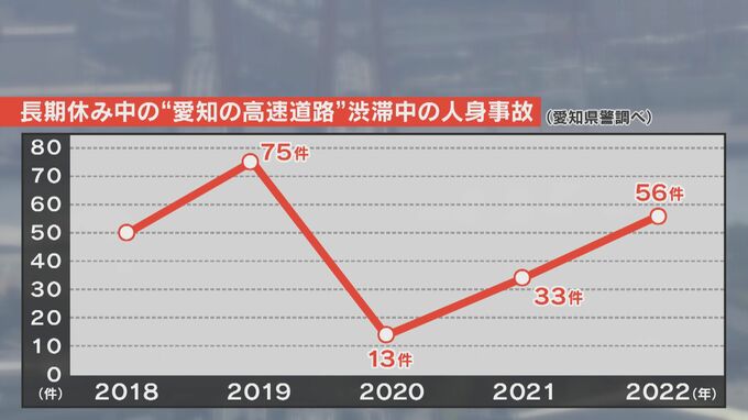 愛知県警によりますと、2018年から2022年までの「お盆休み」や「年末年始」など長期の休み期間に愛知県内の高速道路で発生した渋滞中の人身事故の件数は2019年は合わせて75件でしたが、コロナ禍の2020年には13件まで減少。