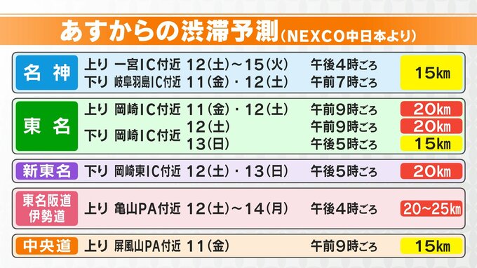 11日から16日までの渋滞予測、この地方で15キロ以上と予測しているポイントです。特に渋滞が激しそうなのは、亀山付近です。一宮とか岡崎インターも、必ず渋滞します。