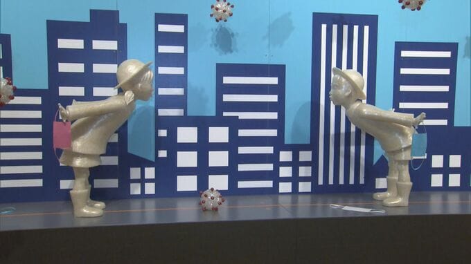 町中で二人の子どもが向かい合うこちらの作品は、未来を担う子ども達に対し、コロナ禍を乗り越え「人と人との繋がり」の大切さを伝えようと、セロハンテープを使って作られています。