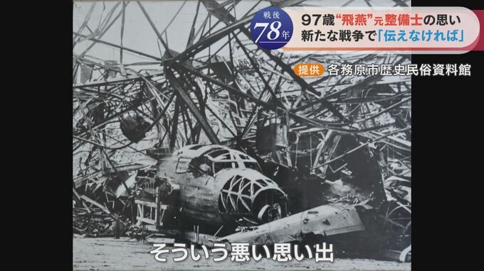 「あそこの穴が空いている所に始動転把を突っ込んで、カーッと回す。そうするとエンジンが始動してOKと言った。バーッとプロペラが回りだした。空襲があるたびに整備をほかって逃げた。助かって工場に帰ってくると飛行場が爆弾でめちゃめちゃになっていて…そういう悪い思い出。苦労して整備したことを思い出す」