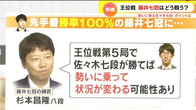 先手番では今シーズン勝率100%と絶好調の藤井七冠に佐々木七段が勝てば、その勢いに乗って状況が変わる可能性があるという見方をされているんです。