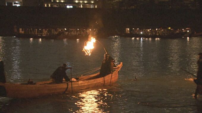 岐阜市の長良川鵜飼では8月19日、豪雨に伴う突風で観覧船が流されて1隻が座礁し、乗客2人が軽いけがをしました。