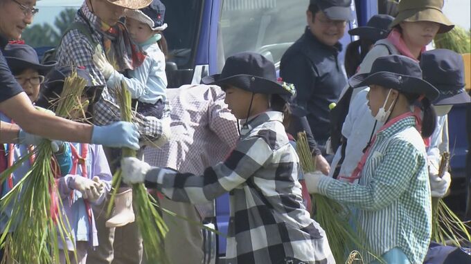 地元の子どもたちなど約100人が参加して、鎌を使いながら400束の稲を収穫しました。