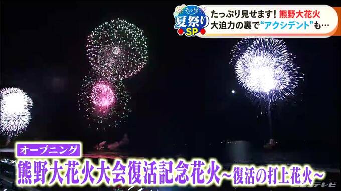 「熊野大花火大会復活記念花火~復活の打上花火~」ど題されたオープニングの花火には4年分の思いが込められていました。